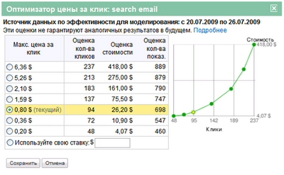 Используя данные за последние семь дней, Оптимизатор цены за клик вычисляет, каково будет потенциальное количество показов объявления, число кликов по объявлению за эти показы и стоимость этих кликов при изменении максимальной цены за клик. Эта функция дает более полное представление об аукционе AdWords, позволяя вам принимать более компетентные решения по изменению ставок, а значит, и достигать поставленных рекламных целей.