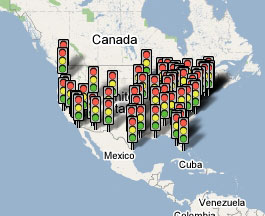 Не прошло и полгода, как Google добавил к google maps информацию о загруженности дорог. Ранее, эта возможность была доступна только в Mobile Google Maps. Для того, чтобы воспользоваться данным сервисом, нужно нажать кнопку Traffic в правом верхнем углу карты. К сожалению, россияни, да еще пол-мира, не могут воспользоваться этой возможностью в гугл мапс, так как такая информация показывается только для крупных городов США (на сегодняшний день число таких городов около тридцати). Гугла подробно объясныет, что означают цвета на карте: