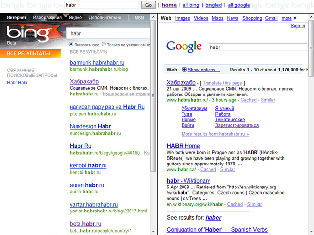 Показывает результаты поиска в Bing и Google side-by-side. Ссылка